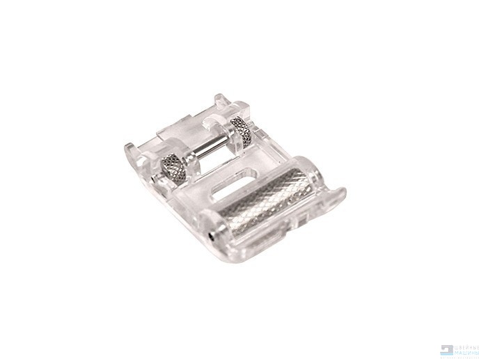 Вместо тефлоновой лапки можно использовать роликовую лапку, которая за счет крутящего момента продвигает ткань вперед. Лапка имеет вращающийся ролик, который позволяет прокатывать под собой ткань любой структуры, будь 100% кожа, или войлок, или вельвет. При шитье с помощью такой лапки стежки получаются равномерной длины. С лапкой очень хорошо проходить любые утолщения на ткани.