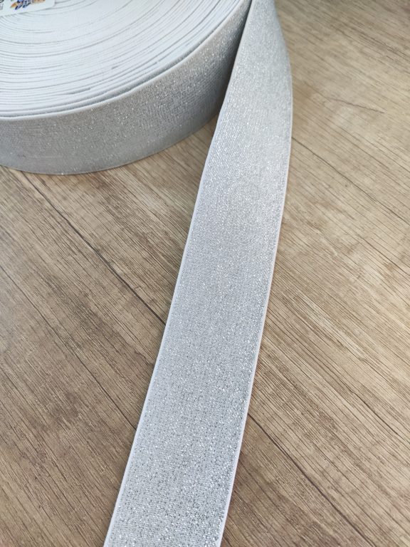 Лента эластичная , блестящая .Белая с серебром . Ширина 4,5 см